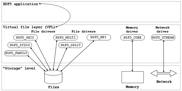 HDF5 accesses a file (the address space) through various types of low-level file drivers. The default HDF5 file storage layout is as an unbuffered permanent file which is a single, contiguous file on local disk. Alternative layouts are designed to suit the needs of a variety of systems, environments, and applications.
