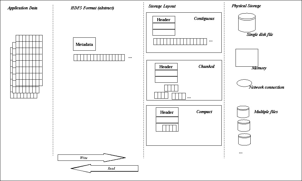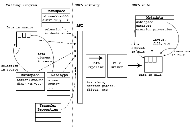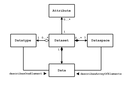 An HDF5 dataset is an object composed of a collection of data elements, or raw data, and metadata that stores a description of the data elements, data layout, and all other information necessary to write, read, and interpret the stored data. From the viewpoint of the application the raw data is stored as a one-dimensional or multi-dimensional array of elements (the raw data), those elements can be any of several numerical or character types, small arrays, or even compound types similar to C structs. The dataset object may have attribute objects. See the figure below.