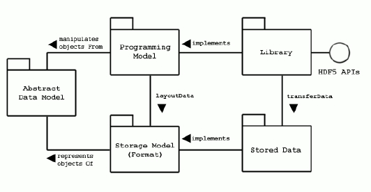 The Hierarchical Data Format (HDF) implements a model for managing and storing data. The model includes an abstract data model and an abstract storage model (the data format), and libraries to implement the abstract model and to map the storage model to different storage mechanisms. The HDF5 library provides a programming interface to a concrete implementation of the abstract models. The library also implements a model of data transfer, an efficient movement of data from one stored representation to another stored representation. The figure below illustrates the relationships between the models and implementations. This chapter explains these models in detail.