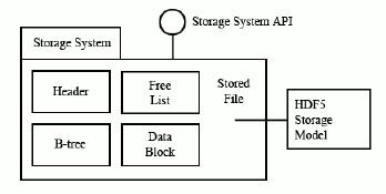 The objects of the HDF5 abstract data model are mapped to the objects of the HDF5 storage model, and stored in a storage medium. The stored objects include header blocks, free lists, data blocks, B-trees, and other objects. Each group or dataset is stored as one or more header and data blocks.