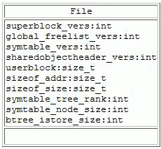 The Level 0 specification defines the header block for the file. Header block elements include a signature, version information, key parameters of the file layout (such as which VFL file drivers are needed), and pointers to the rest of the file. Level 1 defines the data structures used throughout the file: the B-trees, heaps, and groups. Level 2 defines the data structure for storing the data objects and data. In all cases, the data structures are completely specified so that every bit in the file can be faithfully interpreted.