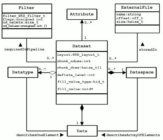 The dataset object manages the storage and access to the data. While the data is conceptually a contiguous rectangular array, it is physically stored and transferred in different ways depending on the storage properties and the storage mechanism used. The actual storage may be a set of compressed chunks, and the access may be through different storage mechanisms and caches. The dataset maps between the conceptual array of elements and the actual stored data.