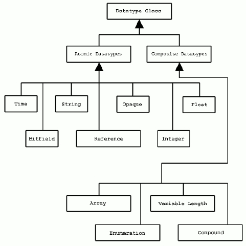 The figure below shows the classification of datatypes. Atomic datatypes are indivisible. Each may be a single object such as a number or a string. Composite datatypes are composed of multiple elements of atomic datatypes. In addition to the standard types, users can define additional datatypes such as a 24-bit integer or a 16-bit float. A dataset or attribute has a single datatype object associated with it. See Figure 7 above. The datatype object may be used in the definition of several objects, but by default, a copy of the datatype object will be private to the dataset.