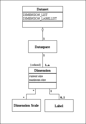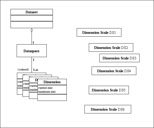 Figure 1 shows UML to illustrate the relationship between a Dimension and a Dimension Scale object. Conceptually, each Dimension of a Dataspace may have zero or more Dimension Scales associated with it. In turn, a Dimension Scale object may be associated with zero or more Dimensions (in zero or more Dataspaces).