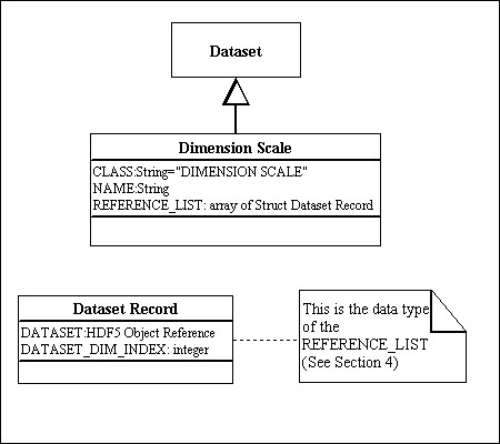 | DATASET | Object Reference. | Pointer to a Dataset that refers to the scale | Set by H5DSattach_scale. Removed by H5DSdetach_scale. |