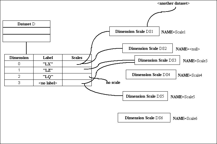 Datasets are linked to dimension scales. Each dimension of a Dataset may optionally have one or more associated Dimension Scales, as well as a label for the dimension. A Dimension Scale can be shared by two or more dimensions, including dimensions in the same or different dataset. Relationships between dataset dimensions and their corresponding dimension scales are not be directly maintained or enforced by the HDF5 library. For instance, a dimension scale would not be automatically deleted when all datasets that refer to it are deleted.