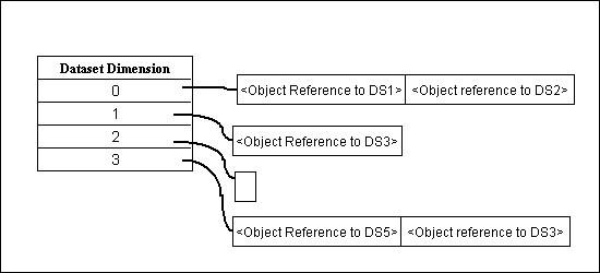 These relationships are represented in the file by attributes of the Dataset D and the Dimension Scale Datasets. Figure 5 shows the values that are stored for the DIMENSION_LIST attribute of Dataset D. This