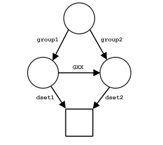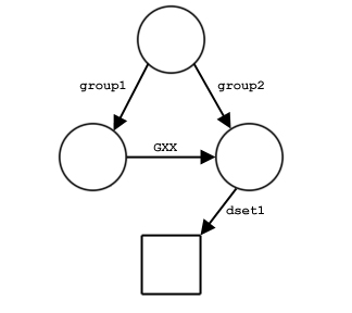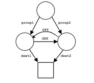 And in part d, two of the groups are members of each other and the dataset is a member of both groups. In this case, there are an infinite number of paths to the dataset because GXX and GYY can be traversed any number of times on the way from the root group, /, to the dataset. This can yield a path name such as /group1/GXX/GYY/GXX/GYY/GXX/dset2.