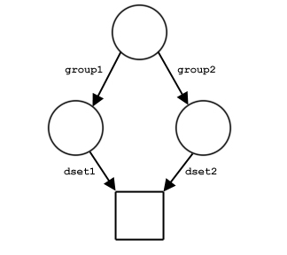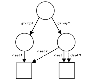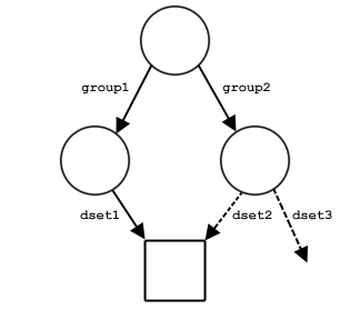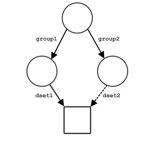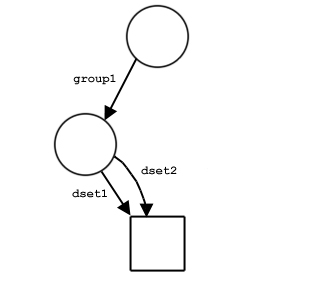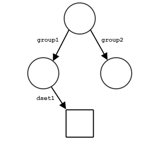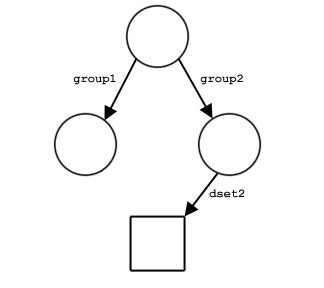 Figure 9 shows examples of the structure of a file with three groups and one dataset. The file in part a contains three groups: the root group and two member groups. In part b, the dataset dset1 has been created in /group1. In part c, a link named dset2 from /group2 to the dataset has been added. Note that there is only one copy of the dataset; there are two links to it and it can be accessed either as /group1/dset1 or as /group2/dset2.