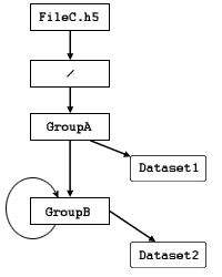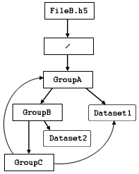 Since an HDF5 file is a directed graph structure, and is therefore not limited to a strict tree structure, and since this illustrated file includes the sort of circular reference that a directed graph enables, Dataset1 can also be identified by this absolute path name: /GroupA/GroupB/GroupC/GroupA/Dataset1