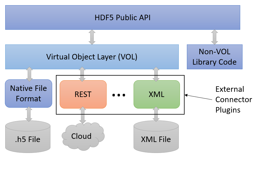 The virtual object layer is an abstraction layer in the HDF5 library that intercepts all API calls that could potentially access objects in an HDF5 container and forwards those calls to a VOL connector, which implements the storage. The user or application gets the benefit of using the familiar and widely-used HDF5 data model and API, but can map the physical storage of the HDF5 file and objects to storage that better meets the application's data needs.
