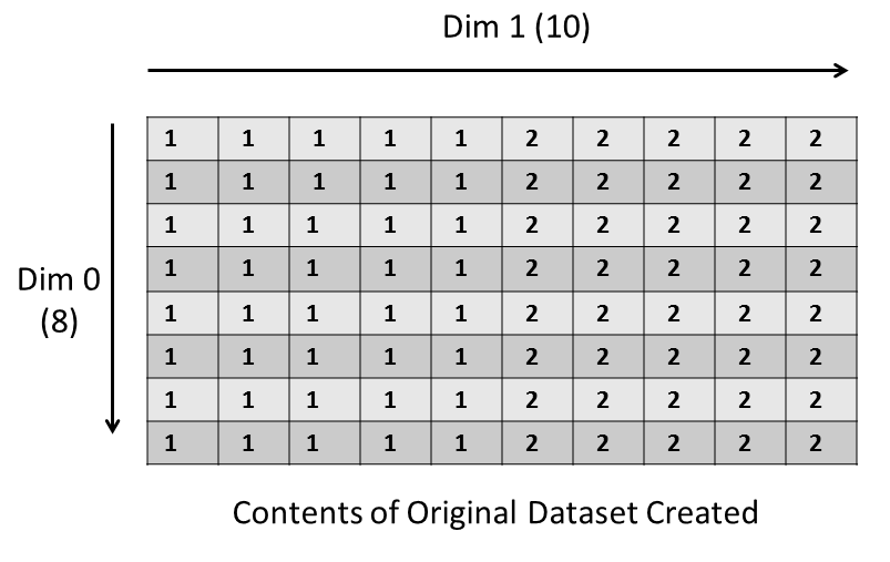 The following image shows the dataset that gets written originally, and the subset of data that gets modified afterwards. Dimension 0 is vertical and Dimension 1 is horizontal as shown below: