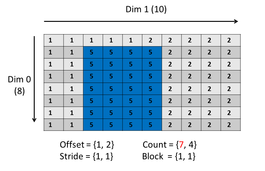The example creates an 8 x 10 integer dataset in an HDF5 file. It then selects and writes to a 3 x 4 subset of the dataset created with the dimensions offset by 1 x 2. (If using Fortran, the dimensions will be swapped. The dataset will be 10 x 8, the subset will be 4 x 3, and the offset will be 2 x 1.)