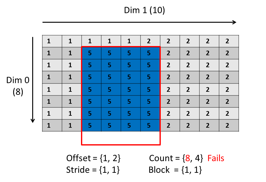 Now try modifying the count as shown below. The write will fail because the selection goes beyond the extent of the dimension: