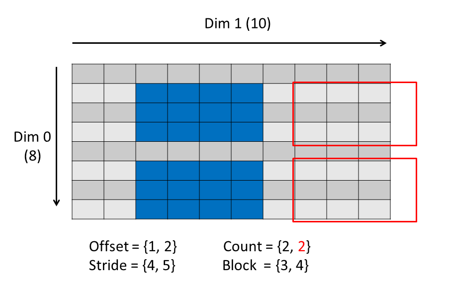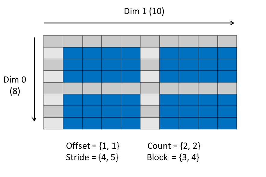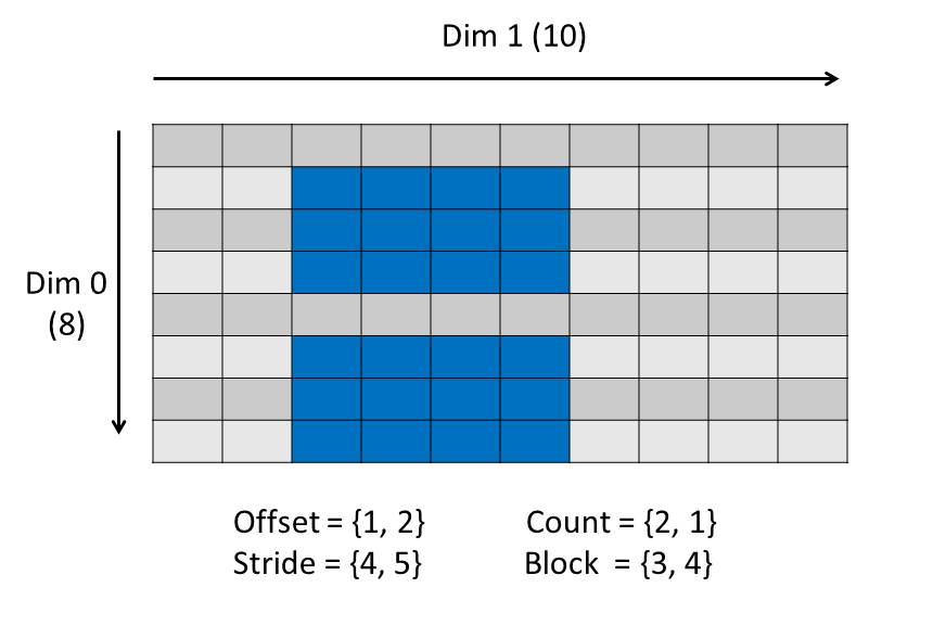 Then select a subset of that dataspace by calling H5Sselect_hyperslab. The offset, count, stride and block parameters of this API define the shape and size of the selection. They must be arrays with the same number of dimensions as the rank of the dataset's dataspace. These arrays ALL work together to define a selection. A change to one of these arrays can affect the others.