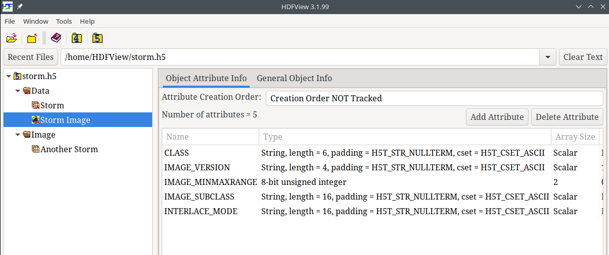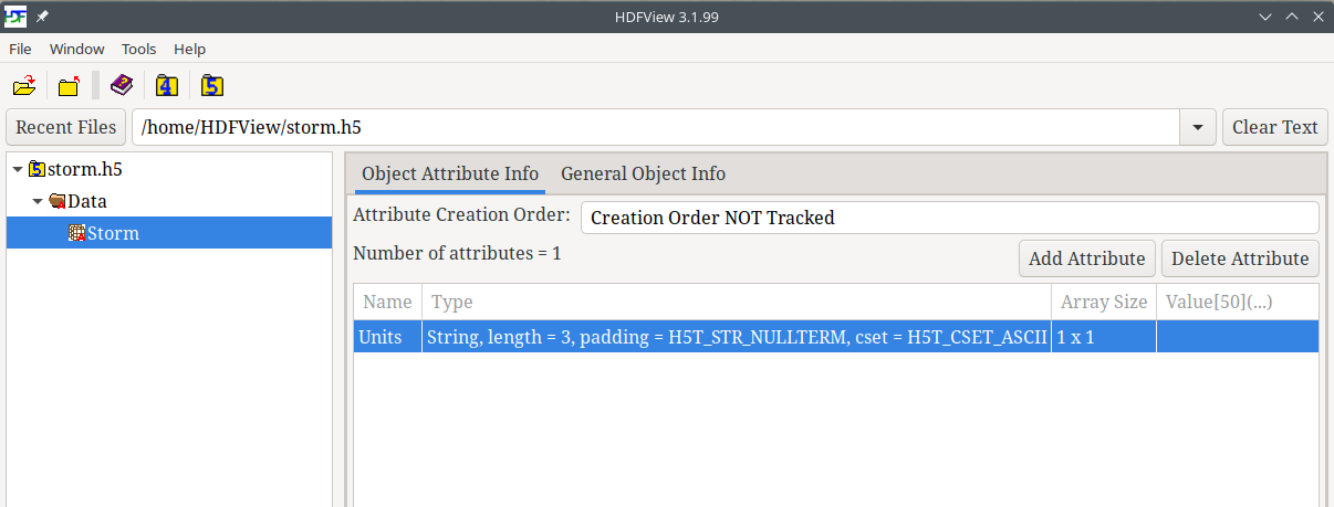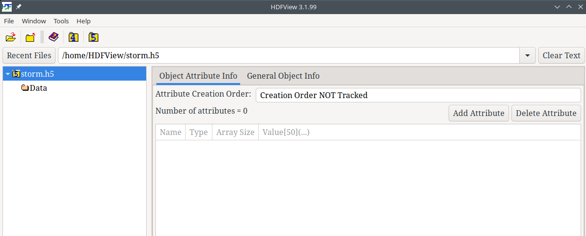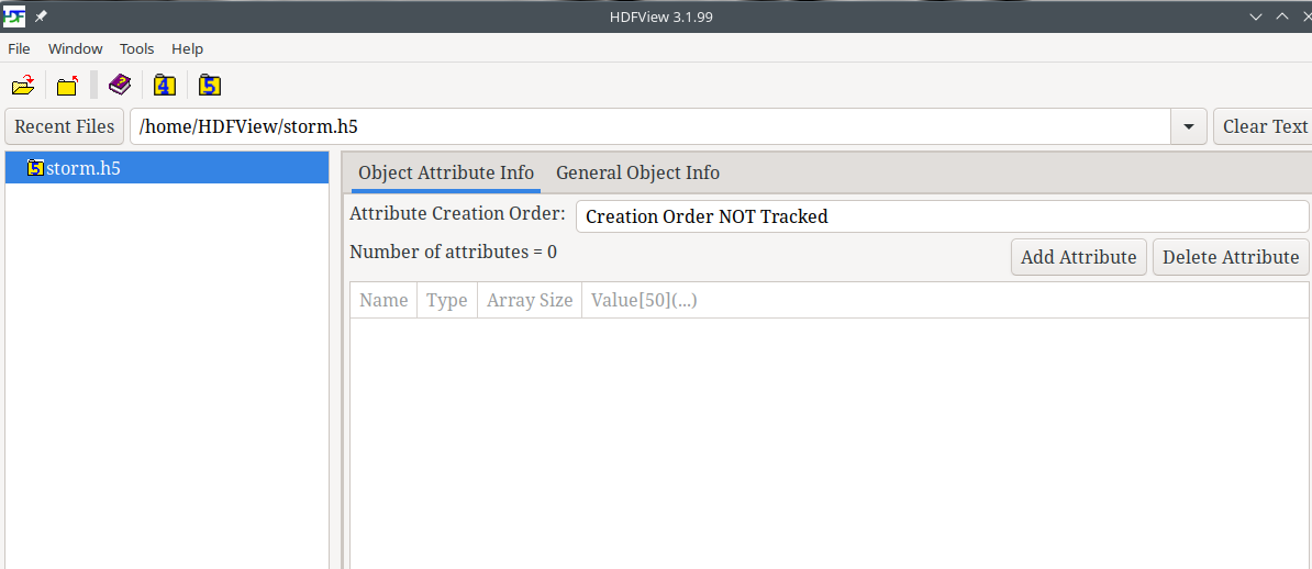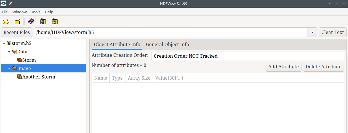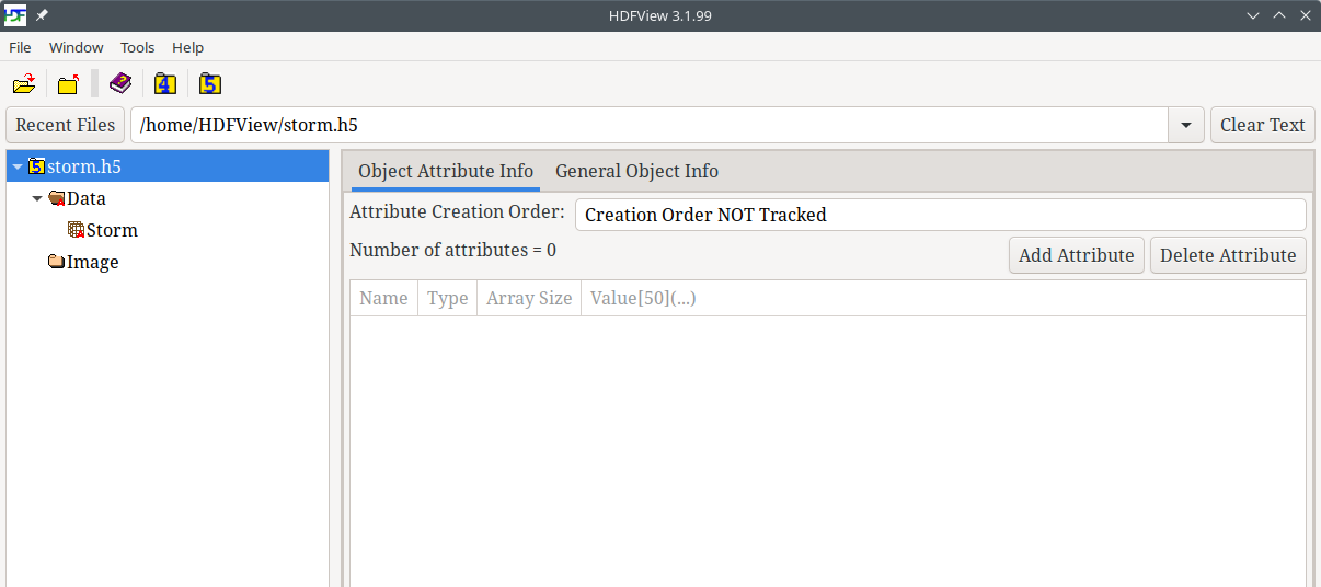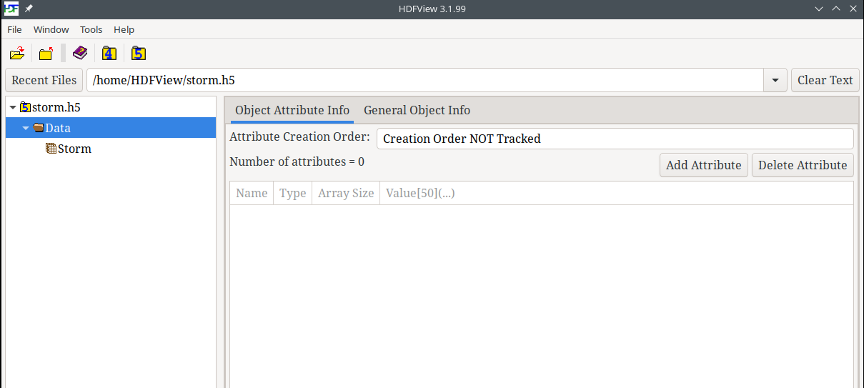 • Click on the /Data folder in the tree view. You will see two tabs, Object Attribute Info and General Object Info, in the pane on the right site of the HDFView window.