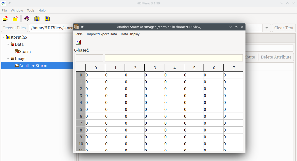 The steps below describe how to create a file (storm.h5), group (/Data), and a contiguous dataset (/Data/Storm) using HDFView. A group is an HDF5 object that allows objects to be collected together. A dataset is an array of data values. A contiguous dataset is one that is stored as a single block in the HDF5 file.