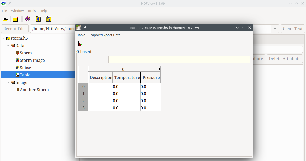 • Specify a location and type in storm.h5 for the name of your file, and click on the Save button. You will see the storm.h5 file in the TableView: