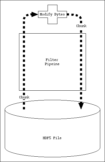 The HDF5 library treats chunks as atomic objects – disk I/O is always in terms of complete chunks (parallel versions of the library can access individual bytes of a chunk when the underlying file uses MPI-IO.). This allows data filters to be defined by the application to perform tasks such as compression, encryption, checksumming, etc. on entire chunks. As shown in Figure 2, if H5Dwrite touches only a few bytes of the chunk, the entire chunk is read from the file, the data passes upward through the filter pipeline, the few bytes are modified, the data passes downward through the filter pipeline, and the entire chunk is written back to the file.