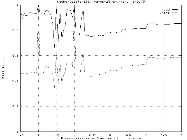 There is a simple way to improve efficiency for this example. It turns out that any chunk that has been completely read or written is a good candidate for preemption. If we increase the penalty for such chunks from the default 0.75 to the maximum 1.00 then efficiency improves.
