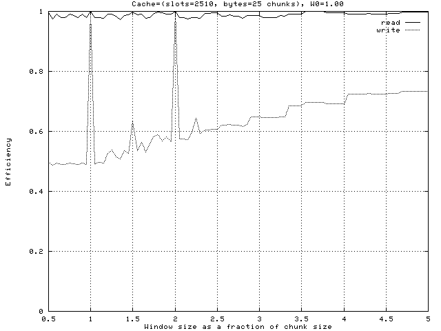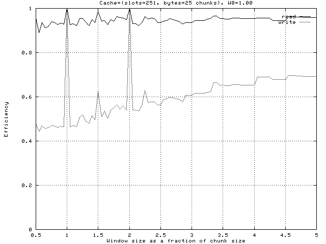 The read efficiency is less than one for two reasons: collisions in the cache are handled by preempting one of the colliding chunks, and the preemption algorithm occasionally preempts a chunk which hasn't been referenced for a long time but is about to be referenced in the near future.