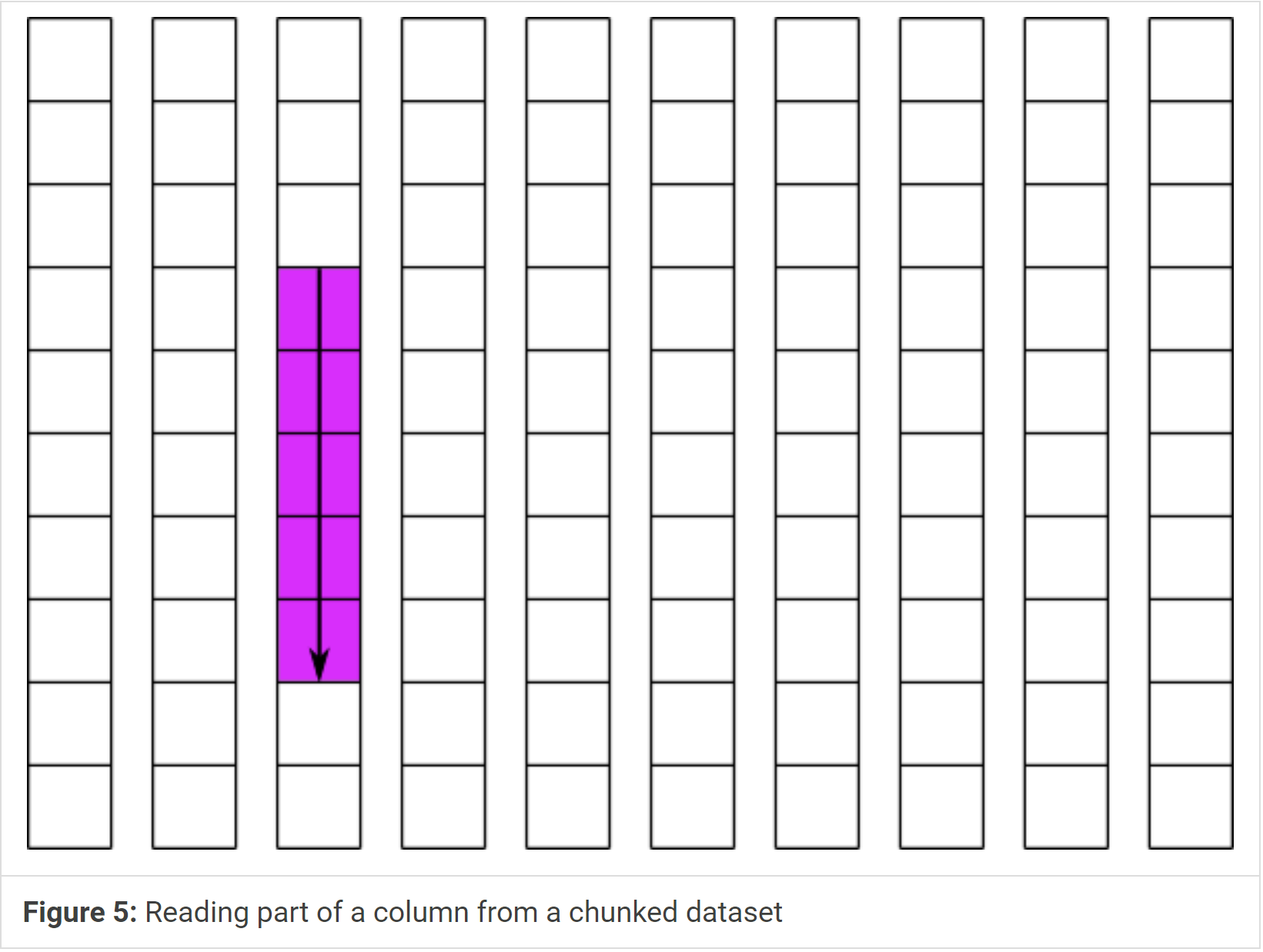The chunks of a chunked dataset are split along logical boundaries in the dataset's representation as an array, not along boundaries in the serialized form. Suppose a dataset has a chunk size of 2x2. In this case, the first chunk would go from (0,0) to (2,2), the second from (0,2) to (2,4), and so on. By selecting the chunk size carefully, it is possible to fine tune I/O to maximize performance for any access pattern. Chunking is also required to use advanced features such as compression and dataset resizing.