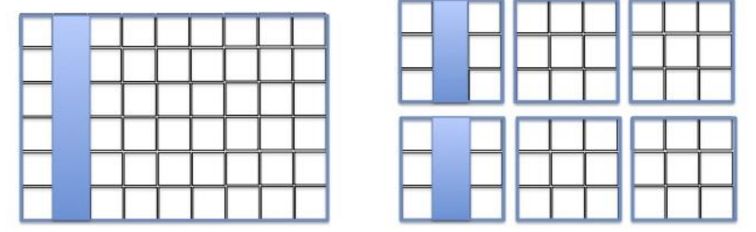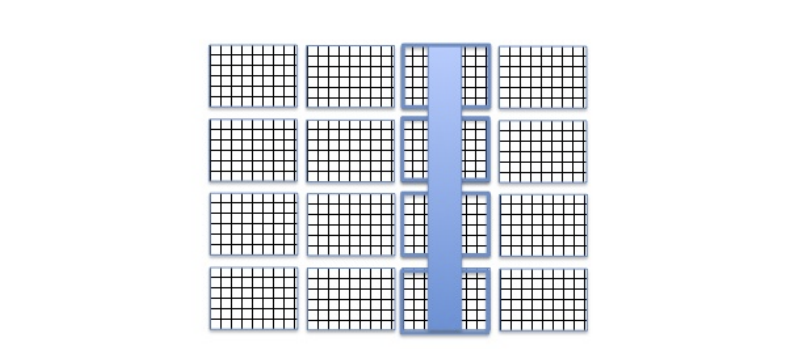 The logical chunk is stored as a contiguous block in the file (compare with the contiguous storage when the whole data array is stored contiguously in the file). When compression is used, it is applied to each chunk separately. During the I/O operation each chunk is accessed as a whole when the HDF5 Library reads or writes data elements stored in the chunk. For example, two chunks will be read (and uncompressed if needed) when accessing the 2nd column as shown in Figure 9.
