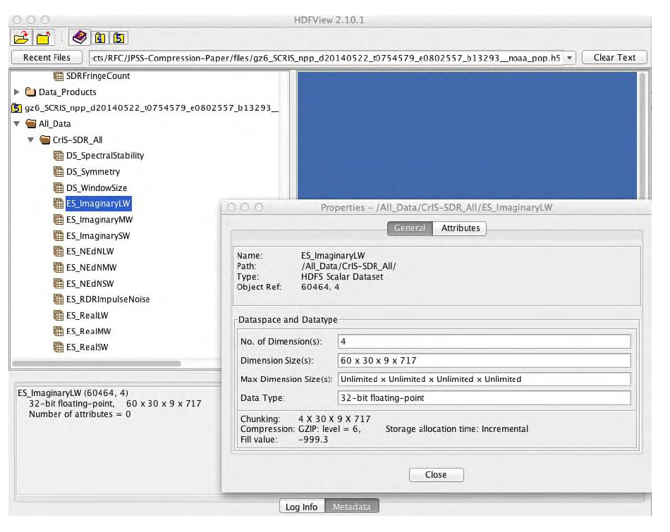 In our case study, we used a 4-dimensional array of 32-bit big-endian floating point numbers stored in the HDF5 dataset /All_Data/CrIS-SDR_All/ES_ImaginaryLW in both files. The data array is extensible and has the current dimension sizes 60x30x9x717. When compressed with gzip compression with level 6, the compression ratio is 1.0762. We used HDF5 command line tools h5dump and h5ls and the HDF Java-based browser HDFView to find various properties of the dataset that would help us to understand performance problems and propose solutions. If the reader decides to follow the discussion using a “hands on” approach, the examples below illustrate how to use h5dump and h5ls to get the characteristics of the /All_Data/CrIS-SDR_All/ES_ImaginaryLW dataset.