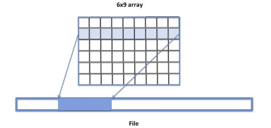 The default storage layout of HDF5 files is contiguous storage: data of a multidimensional array is serialized (or flattened) along the fastest changing dimension and is stored as a contiguous block in the file. This storage mechanism is recommended if the size of a dataset is known and the storage size for the dataset is acceptable to the user: in other words, no data compression is desired. The contiguous storage is efficient for I/O if a whole HDF5 dataset is accessed or if a contiguous subset (as stored in the file) of an HDF5 dataset is accessed. The figure below shows an example with a row of a 2-dimensional array stored in an HDF5 dataset by a C application. In this case, the HDF5 Library seeks to the start position in the file and writes/reads the required number of bytes.