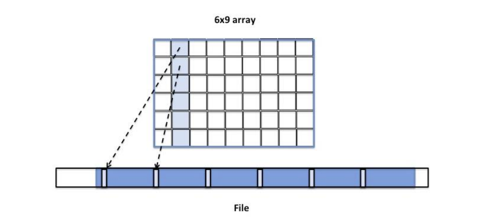 If we change the access pattern to accessing the dataset by columns instead of by rows, the contiguous layout may not work well. The column’s elements are not stored contiguously in the file (see Figure 8). Accessing a column will require several seeks to find the data in the file and multiple reads/writes of one element at a time. Seeks and small size I/O operations may affect performance especially for large datasets. Obviously, contiguous storage is not as favorable for a column access pattern as it is for a row access pattern, and other storage options may be more beneficial.